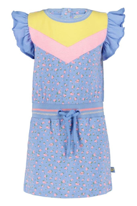 4PRESIDENT Leata meisjes jurk met kap mouwen, allover bloemen print en kleurvakken aan de bovenkant, ruches bij de mouwen, elastische tailleband met koord en rok met steekzakken. 95% katoen, 5% elastaan